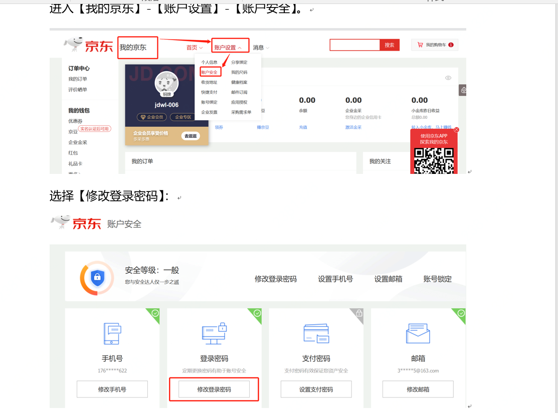 请各馆尽快修改密码,修改密码方式如下:用户名和密码登录www.jd.com后,首页点击用户名,进入我的京东-账户设置-账户安全,选择修改登录密码。